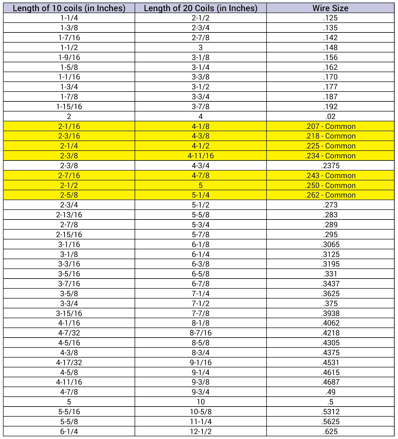 #4 Garage door replacement spring wire size as per chart. Yellow highlighted sections are common spring wire sizes.